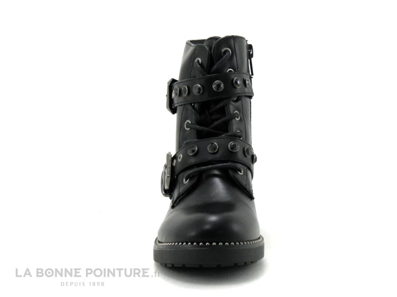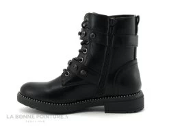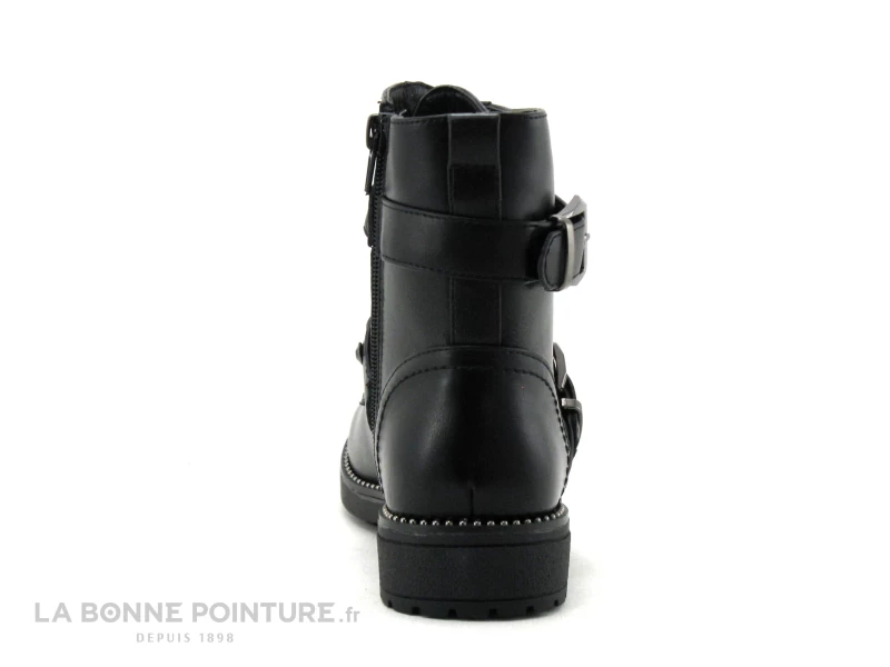 Cette bottine fille petit prix Wipop Dubreuil est en simili cuir noir, avec deux lanières ornées de perles noires et fermées par des boucles argent.