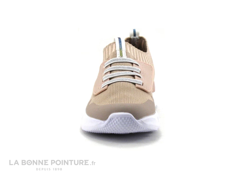 Cette tennis fille est en maille rose clair pailletée, avec des élastiques argentés sur le dessus.